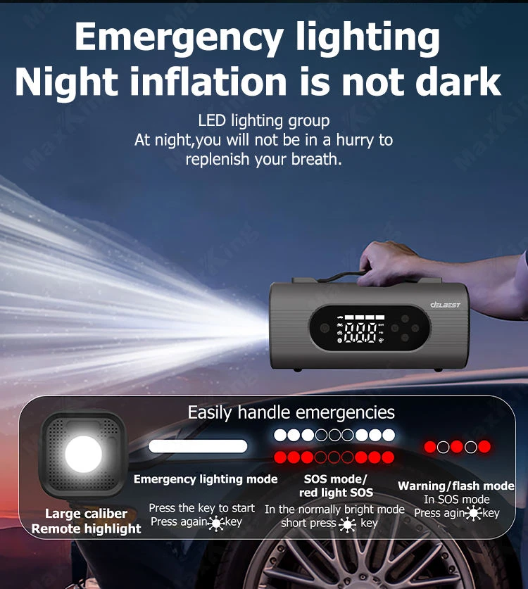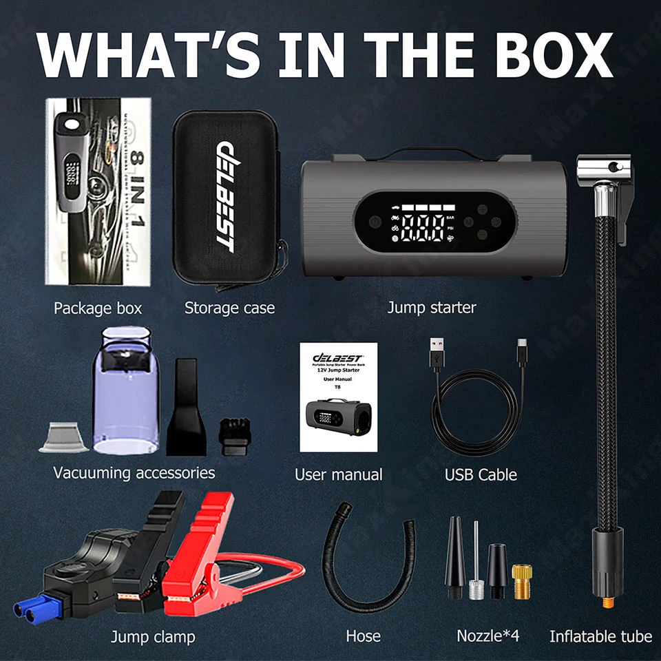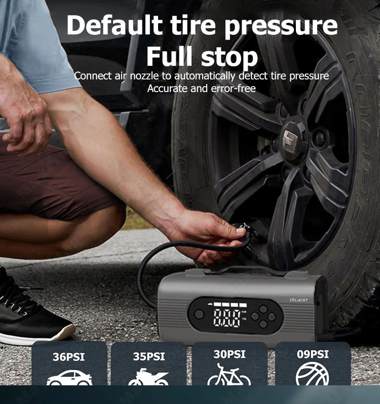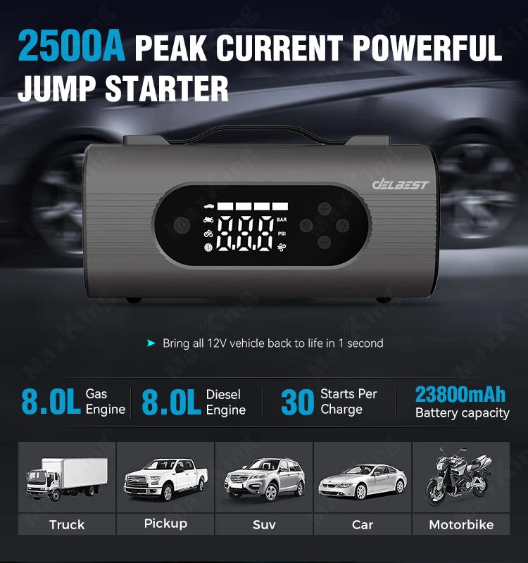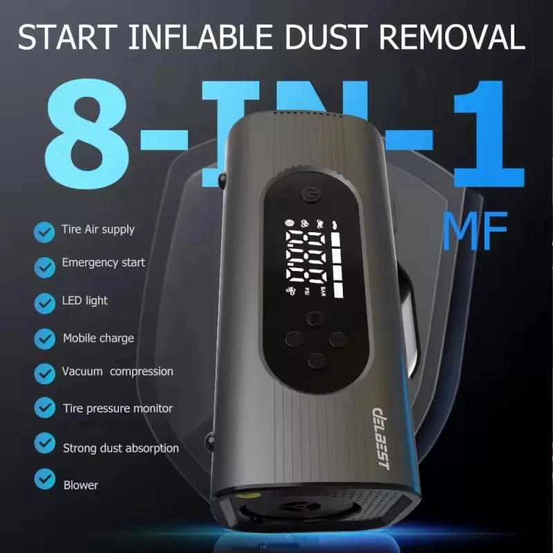 The Delbest Q20 8-in-1 Tire Inflator & Jump Starter is an all-in-one emergency power solution designed for drivers who value reliability, safety, and convenience. Combining a 23800mAh lithium battery, a 22L/min air compressor, and a high-powered 1500A/2500A jump starter, it delivers exceptional performance for both gasoline and diesel vehicles.
