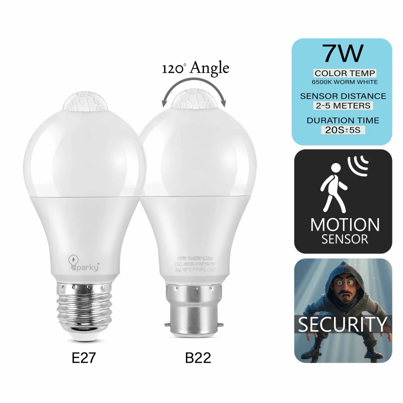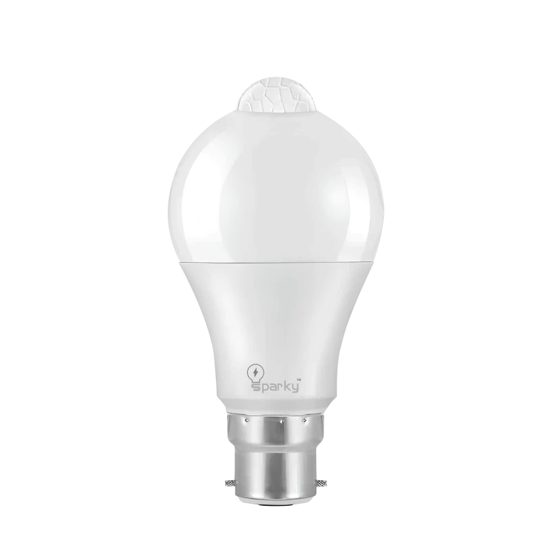 The Sparky PIR Motion Sensor 7W LED Bulb is a smart, energy-efficient lighting solution ideal for indoor and outdoor use. With its built-in infrared motion sensor, the bulb automatically lights up when it detects motion within its range and switches off after inactivity, saving power effortlessly. Designed for E27 (Pin) and B22 (Patch) holders, it delivers bright warm white illumination that’s perfect for corridors, stairways, entrances, and pathways.